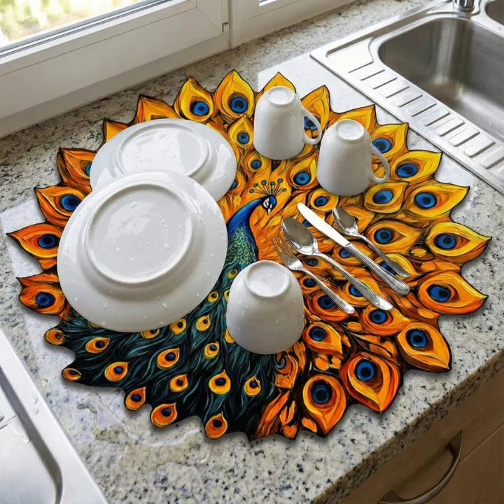 🦚 Peacock Elegance Mat – Luxury Feather Design Dish Drying & Kitchen Counter Protection Mat ✨